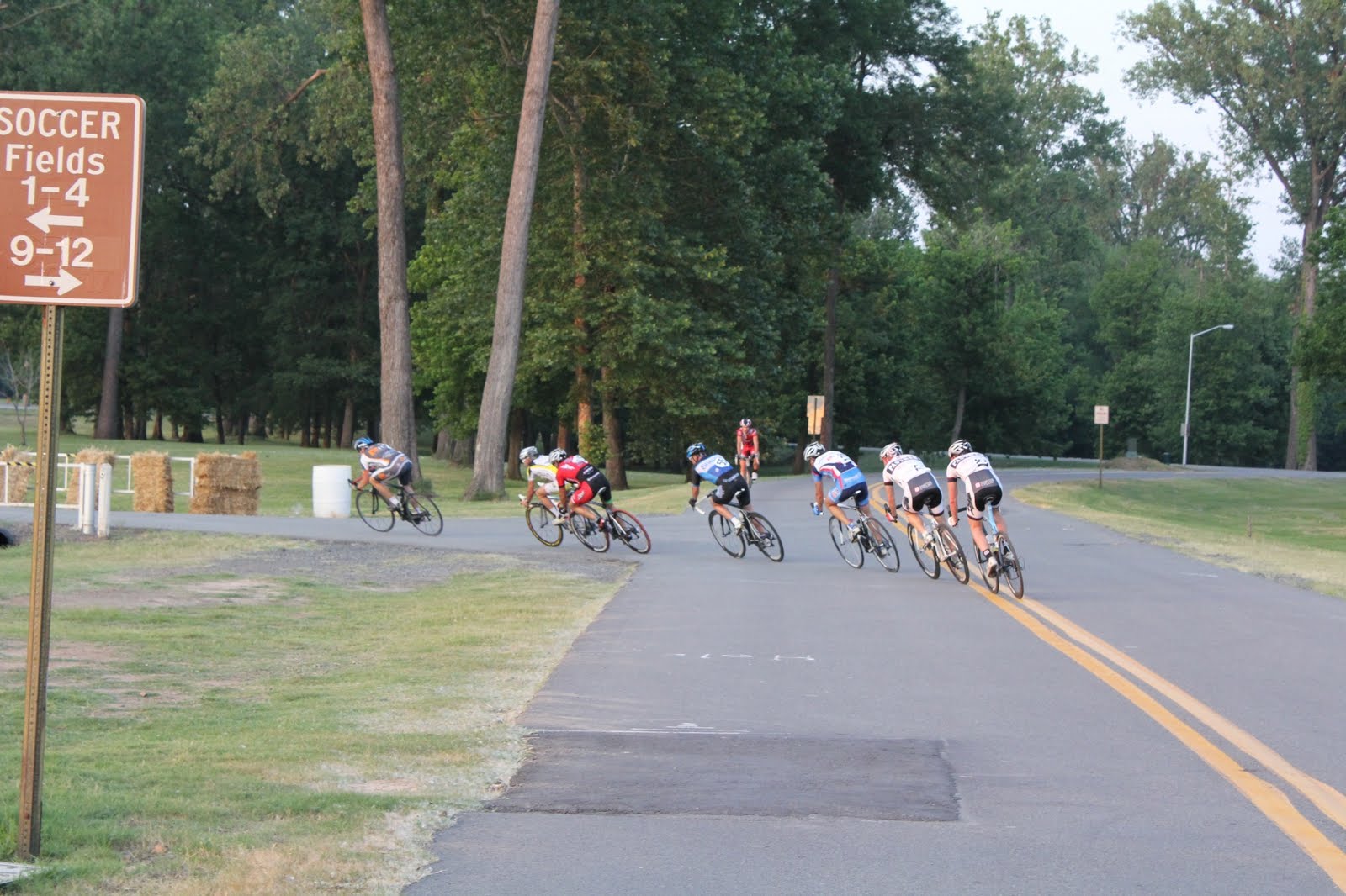 I returned from a loop around the River Trail just as the break developed in the "A" race. The race was fast and none of the attempts at bridging out of the pack to this bunch came close. Last week's winner, Kris French, missed the break but he had a teammate up there in the form of veteran Hunter East. Hunter is a near legend, having had a long and successful racing career before laying off competition a few years ago. I'm not sure what has him fired up, perhaps his son Evan's interest in racing, but Hunter has been showing the power and he is among those riders who really understand bike racing strategy.